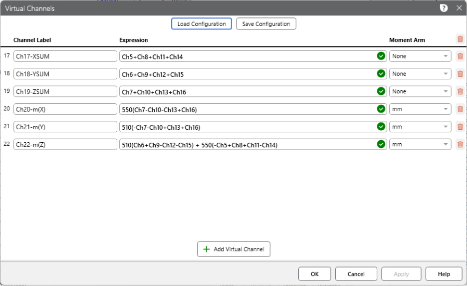 Virtual channels are the result of a user-defined expression that combines input channels. They perform linear math in the time domain and can reference channels across hardware units.