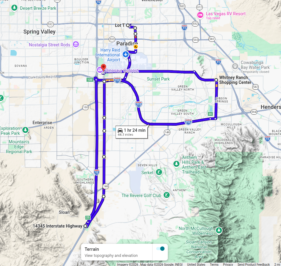 The default sample rate of 65,536 Hz was selected. This high rate should be more than adequate to accurately measure any events experienced. The route taken consisted of 44.3 miles. Several of the roads were fairly rough due to ongoing construction including Maryland Parkway, parts of Las Vegas Blvd, and parts of East 215. The speeds ranged between stop and go due to heavy traffic areas up to 70 mph.
