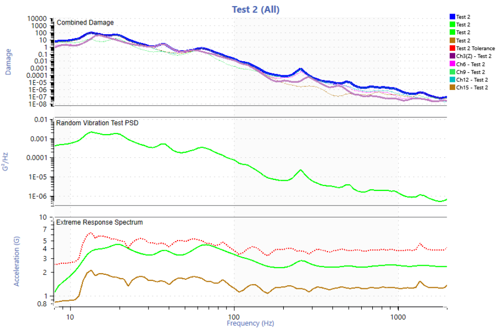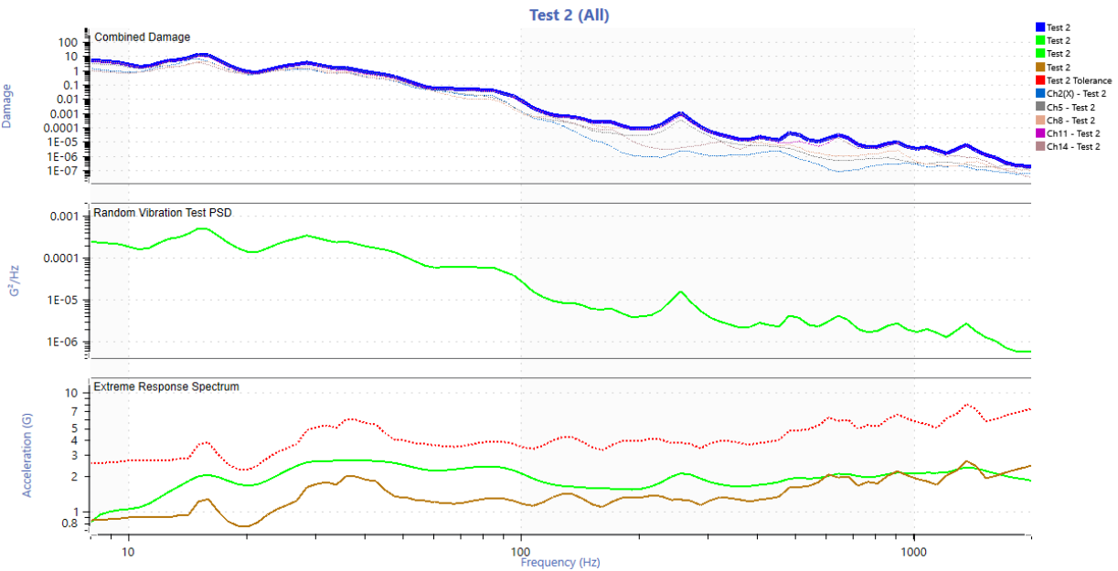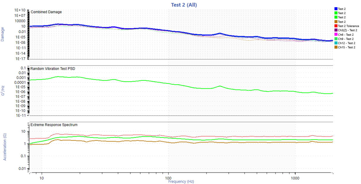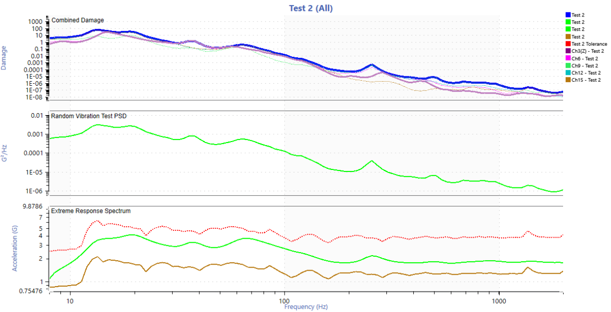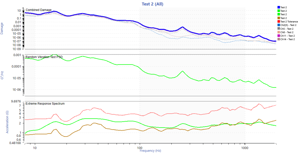 The route consisted of a total distance of 44.3 miles. The entire route was assumed to be a typical daily routine and the number of life passes was calculated by taking 200,000 miles and dividing that by 44.3 miles which is 4,515 life passes (note: an incorrect total distance of 35 miles was used initially which led to using 2,857 life passes for 100,000 miles and 5,714 life passes for 200,000 miles, Figures 11-20 reflect this incorrect value. Figures after this use the correct value). The settings described in the “Field Data to Vibration Profile With FDS” link were mostly used. A 2 Hz high pass filter was applied to the entire data set and two anomalies were removed (extremely square wave two cycles of x10^20 G and an extremely high reading on one sensor and not seen at all on any of the other sensors).