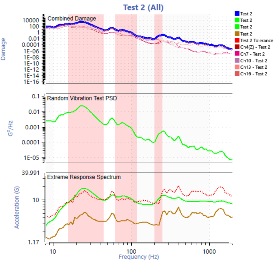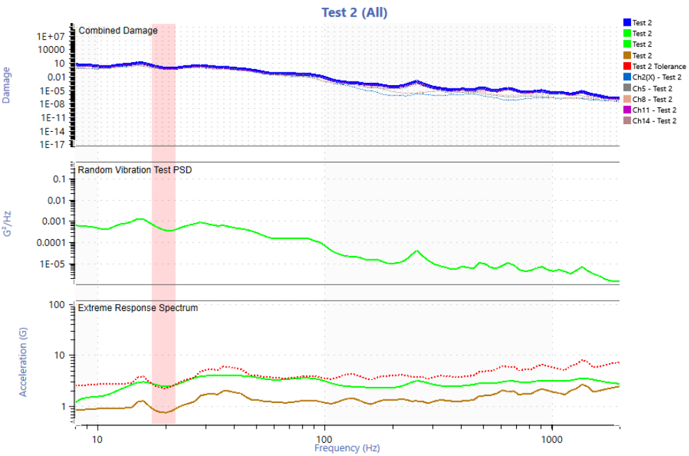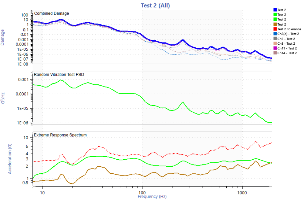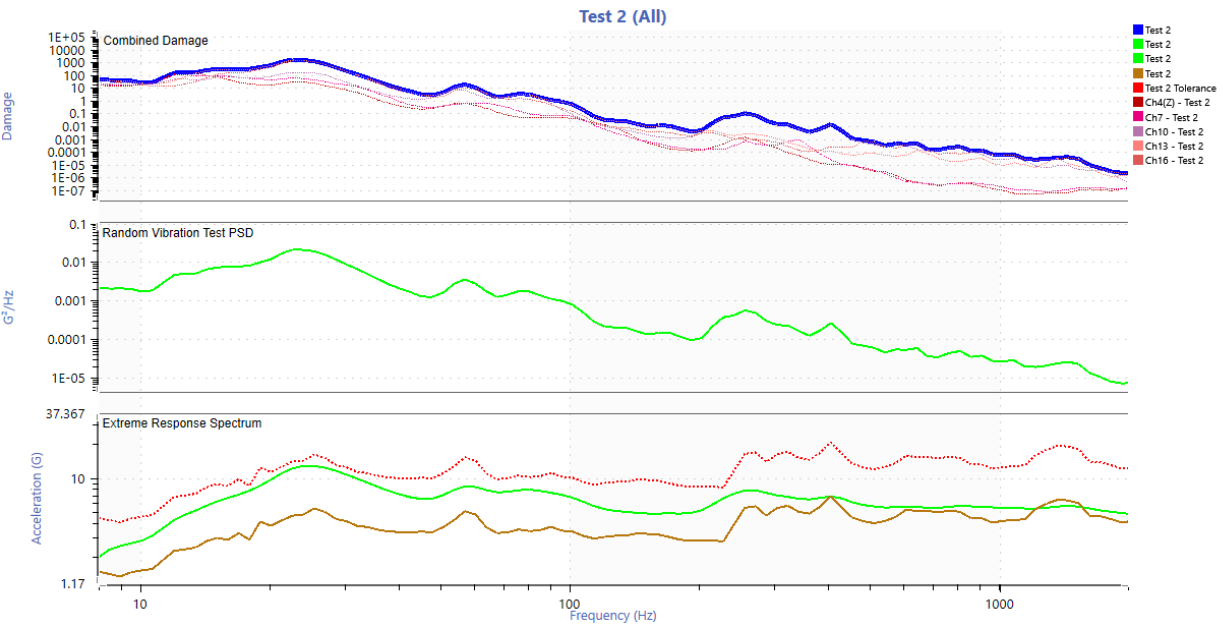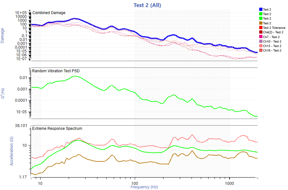 The route consisted of a total distance of 44.3 miles. The entire route was assumed to be a typical daily routine and the number of life passes was calculated by taking 200,000 miles and dividing that by 44.3 miles which is 4,515 life passes (note: an incorrect total distance of 35 miles was used initially which led to using 2,857 life passes for 100,000 miles and 5,714 life passes for 200,000 miles, Figures 11-20 reflect this incorrect value. Figures after this use the correct value). The settings described in the “Field Data to Vibration Profile With FDS” link were mostly used. A 2 Hz high pass filter was applied to the entire data set and two anomalies were removed (extremely square wave two cycles of x10^20 G and an extremely high reading on one sensor and not seen at all on any of the other sensors).
