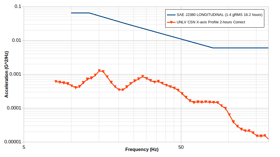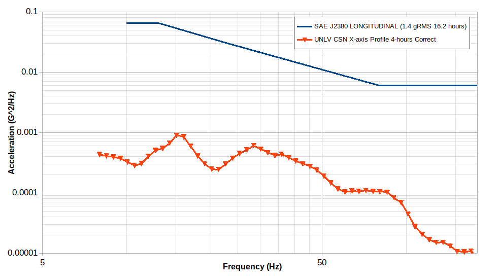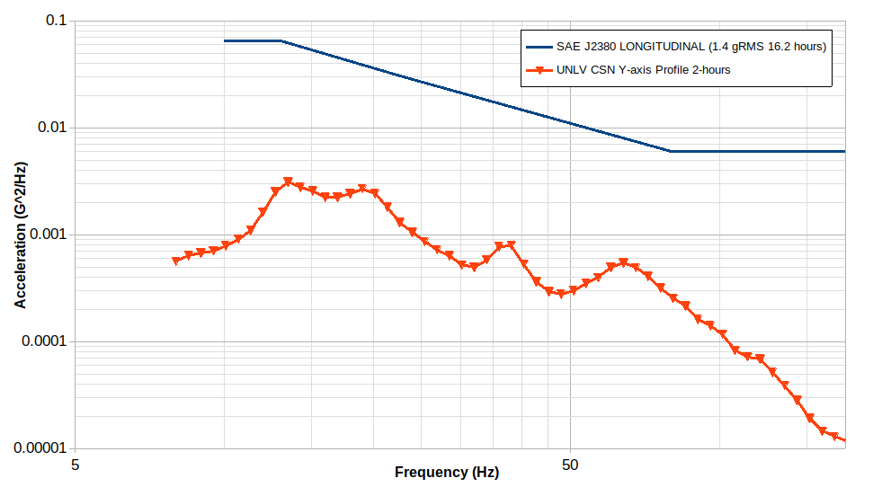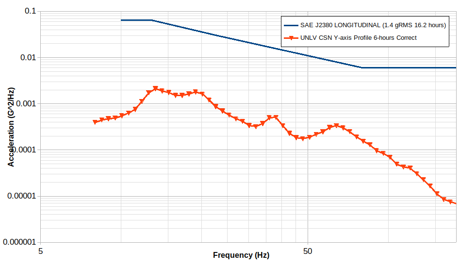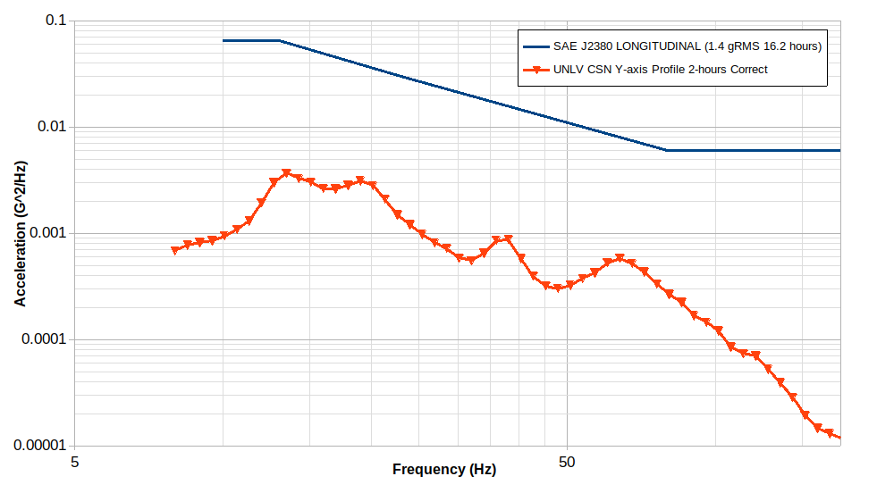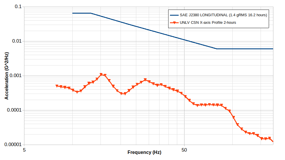 The SAE J2380 profile is more intense than the one developed from field data in Las Vegas. It is suspected that the roads used in Las Vegas may not have been as rough as those used to develop the SAE J2380 profile and/or the vehicle tested had higher shock absorbing capabilities that dampened the shocks felt by the battery pack.
