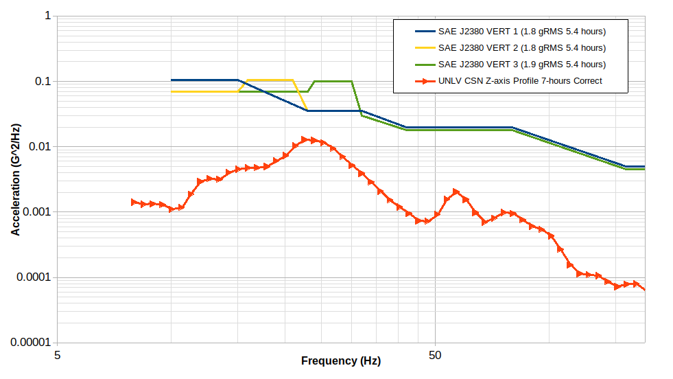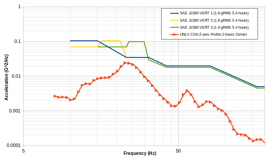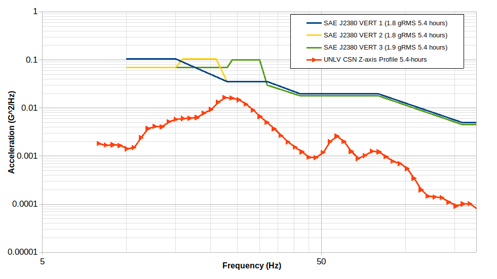 Very little difference was observed between the two UNLV-CSUN developed vertical profiles so the difference between them and the SAE J2380 profile were not due to number of life cycles, Kurtosis, or target runtime.