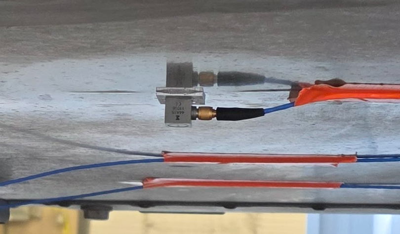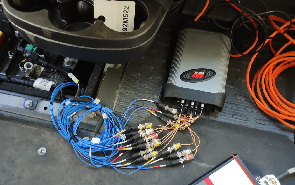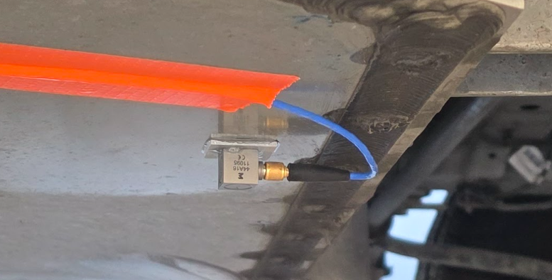 After the glue was dry, each aluminum piece with an accelerometer and screw was installed in the locations shown in Figure 1. Each location’s surface was cleaned with a small towel with isopropyl alcohol. The underside of the aluminum pieces were glued to the cleaned surface. The accelerometer cables were fed through an existing opening in the floor of the vehicle and connected to the Vibration Research ObserVR1000.