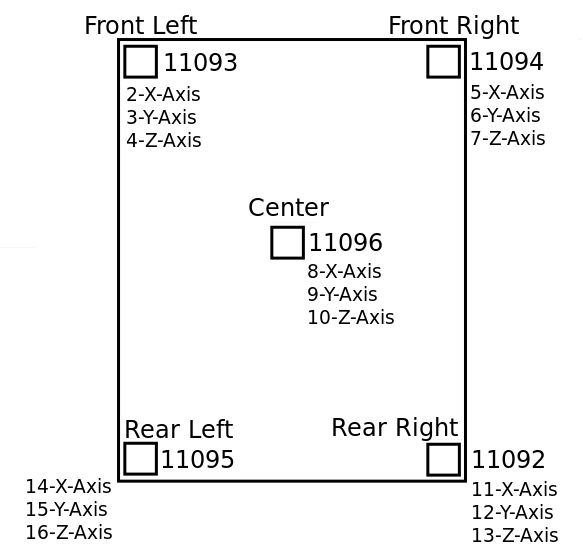Here are the accelerometer serial numbers, their locations, and their orientation data labels: